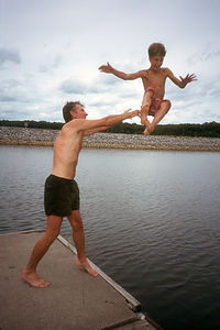 Herb tossing Tommy in Lake BarclayThe Land Between Lakes (known locally as LBL) is a 170,000 acre National Recreation Area that lies on a narrow strip of land between Lake Barkley and Kentucky Lake in Trigg and Lyon Counties in Kentucky and Stewart County in Tennessee. The park was created in 1961 by President John F. Kennedy with the intent that it be used by the Tennessee Valley Authority as a demonstration in resource development. Today, the park is wholly owned by the federal government. The last private residents left in 1970.